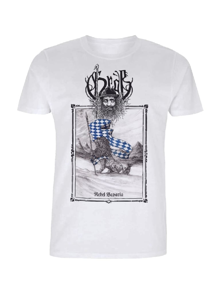 White shirt (brand: B&C), front print only. Our tribute to Bavaria. Drawn by French artist David Thiérrée exclusively for GRÀB. The drawing shows the traditional Bavarian lion, the flag and also the Wolpertinger - a mythical forest creature told of in old Bavarian legends.